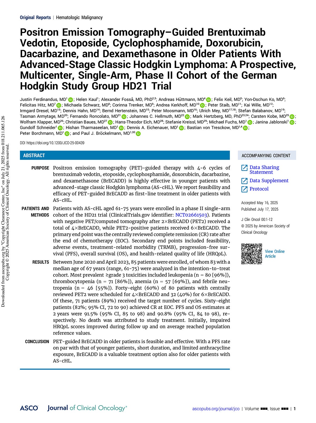 The HD21 phase 2 study is a prospective, international, multicenter, single-arm supplemental cohort within the HD21-study for patients involving 85 patients aged 61-75 years with newly diagnosed, advanced-stage, cHL. The study assessed the efficacy and safety in elderly patients. [1]